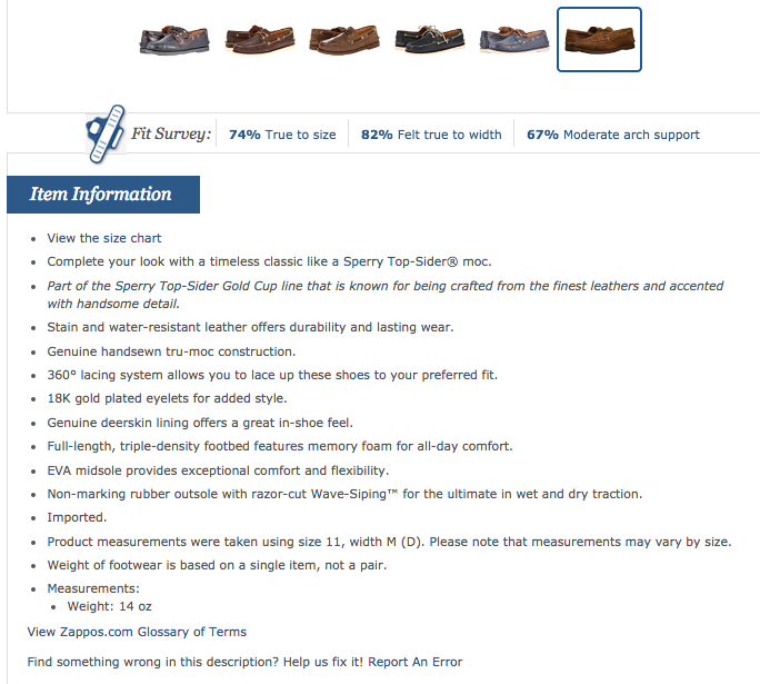 ลองมาดูตัวอย่าง คำบรรยายสินค้าของแบรนด์รองเท้า Zappos รุ่น Sperry ดังรูปด้านล่างกันเลยค่ะ