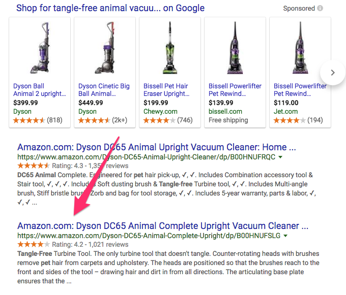 และนี่คือหนึ่งตัวอย่างสินค้าที่ถูกค้นหาเจอเป็นอันดับแรกเมื่อค้นหาด้วยคำว่า tangle-free vacuums ในเว็บ Amazon