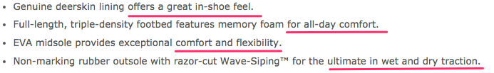 ตัวอย่างเช่น คำอธิบายบอกว่า รองเท้าถูกบุด้วยหนังกลับ (Deerskin Lining) ถ้าไม่อธิบายเพิ่มก็อาจจะไม่ได้คิดต่อว่า บุหนังกลับแล้วเป็นประโยชน์ยังไง แต่พวกเขากลับอธิบายประโยชน์เพิ่มเติมไปว่า “บุหนังกลับในรองเท้าแล้วทำให้ความรู้สึกตอนใส่นั้นดีมากขึ้น”